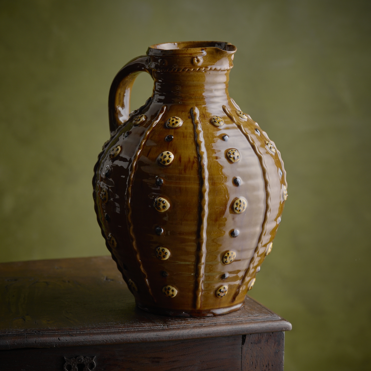 A large, round bellied, applique jug with slip trailed buttons on a toffee coloured background.