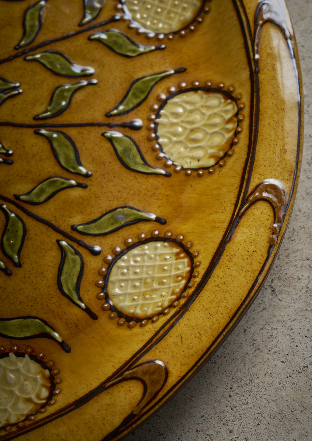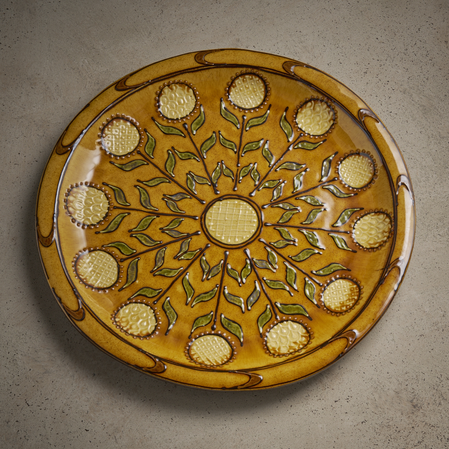 A press moulded charger with a slip trailed dandelion clock motif. This piece was decorated during the International Ceramics Festival at Aberystwyth. There is a film here showing it being done.