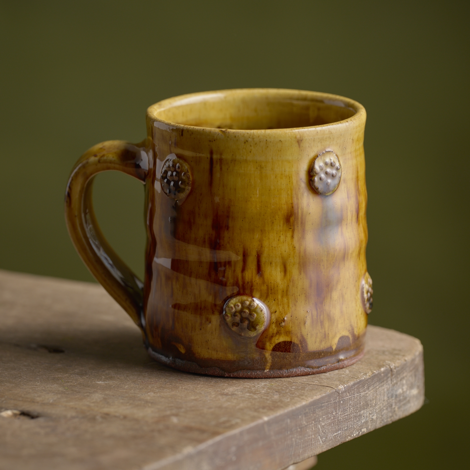 A softly thrown mug in a rich honey colour with dot sprig decoration.