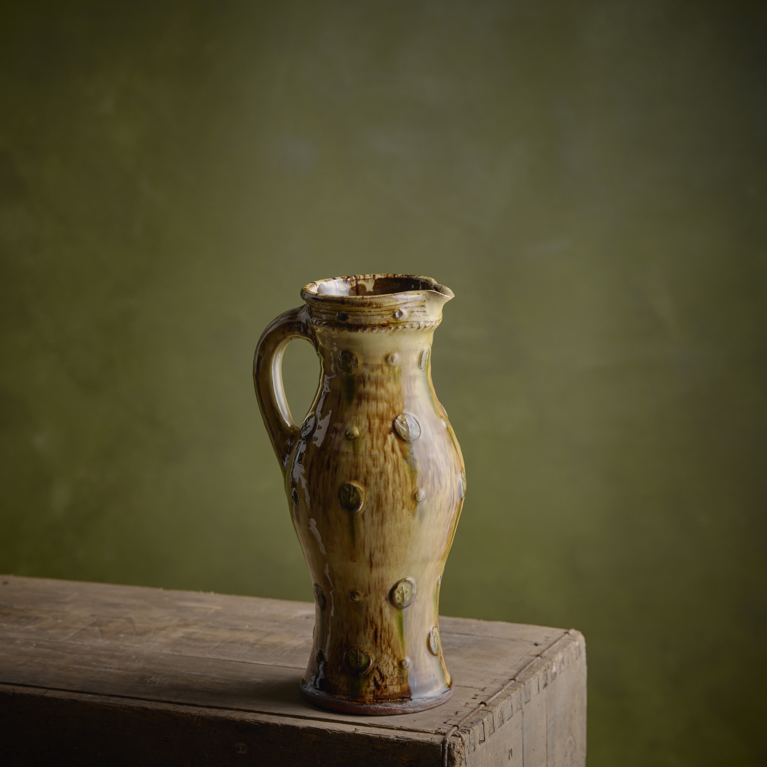 A slender baluster jug with sprigged decoration under a mottled yellow slip.